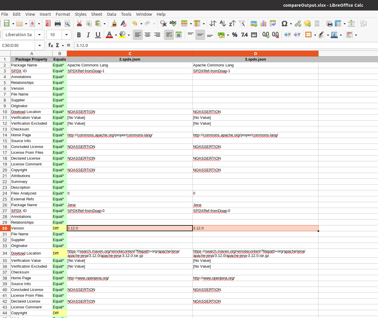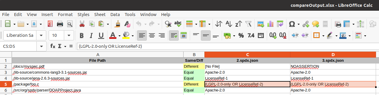 $ java -jar tools-java-1.1.0-jar-with-dependencies.jar CompareDocs compareOutput.xlsx ../testResources/SPDXJSONExample-v2.2.spdx.json ../testResources/SPDXJSONExample-v2.3.spdx.json