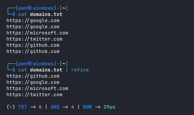 Using refine for sorting the lines from the standard input (stdin). The deduplicated output is displayed on the terminal without modifying the original file. This method is ideal for viewing results without altering the source file.