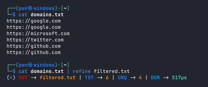 Using the refine for sorting the lines from the standard input (stdin), and writes the deduplicated output to a new file specified as an argument. This allows users to create a new file with cleaned data while preserving the original content. Note: If the specified file already exists and contains data, it will also be sorted.